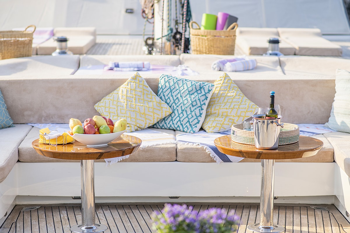 TV, DVD player, Wi-Fi mobile internet connection, USB connection for multimedia devices, Board games, cards, ice maker, Espresso machine, Watermaker, Solar panels, Air condition, Full regulation safety equipment, Possibility of eating in a salon in case of bad weather