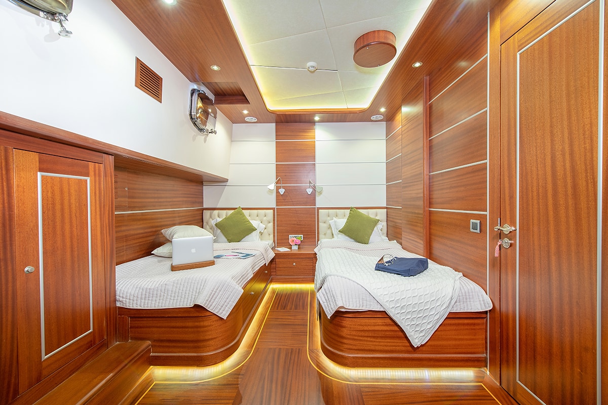 • 2 Twin cabins: Cabin with twin bed. Private bathroom with shower box and home-type toilet.