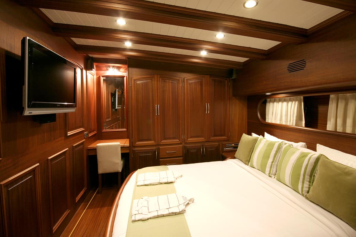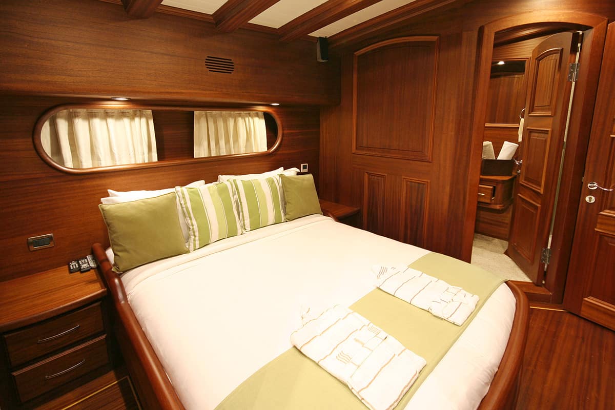 It features two spacious master cabins, two double cabins, and two cabins, that all come with ensuite bathrooms, power shower or jacuzzi tub air-conditioning, and TV.