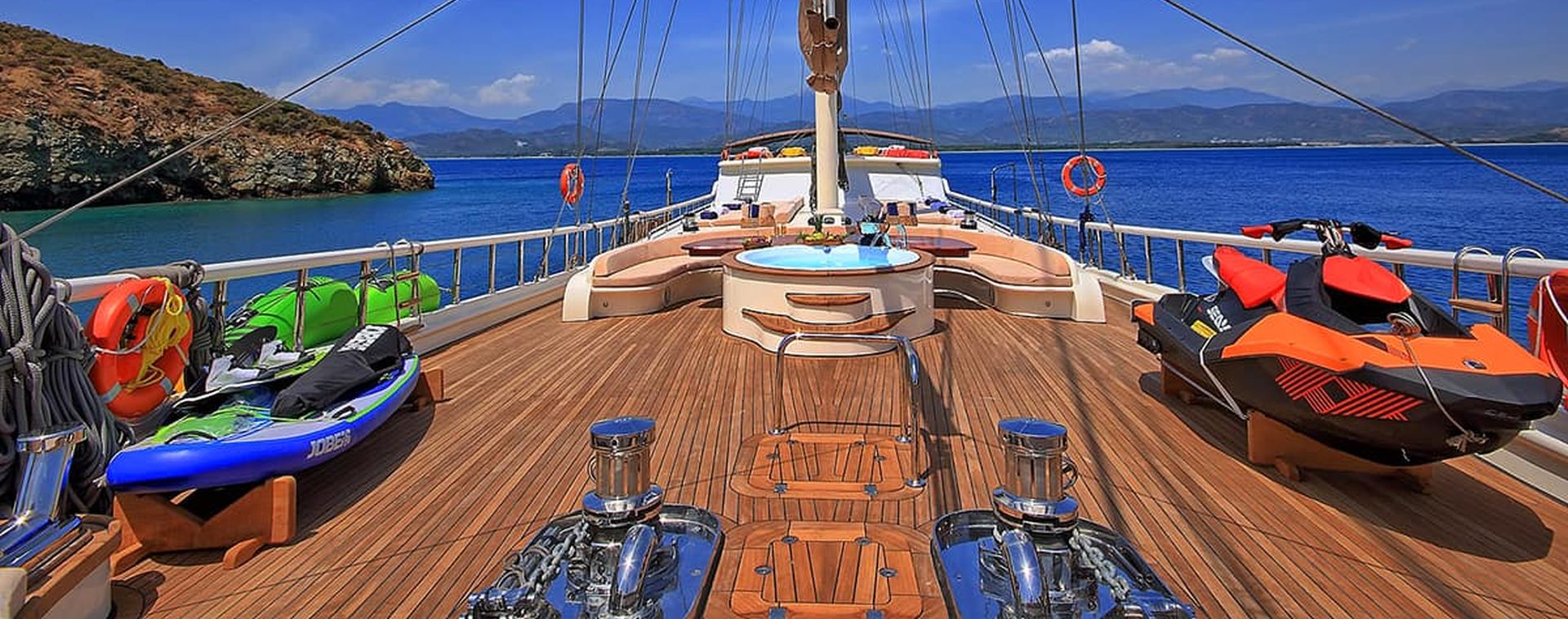 Tender boat, Water skiing: fuel per usage, Jetski: 250€ + fuel per usage, Ringo ride: fuel per usage, Wakeboard: fuel per usage, Canoe, Paddleboard, Windsurfer, Sun mattresses, Jacuzzi on deck, Sun sail for shade in front of the gulet, a Leisure area in the backside of the deck, Barbecue, Fishing equipment for kids, Sets of masks, snorkels, and flippers…